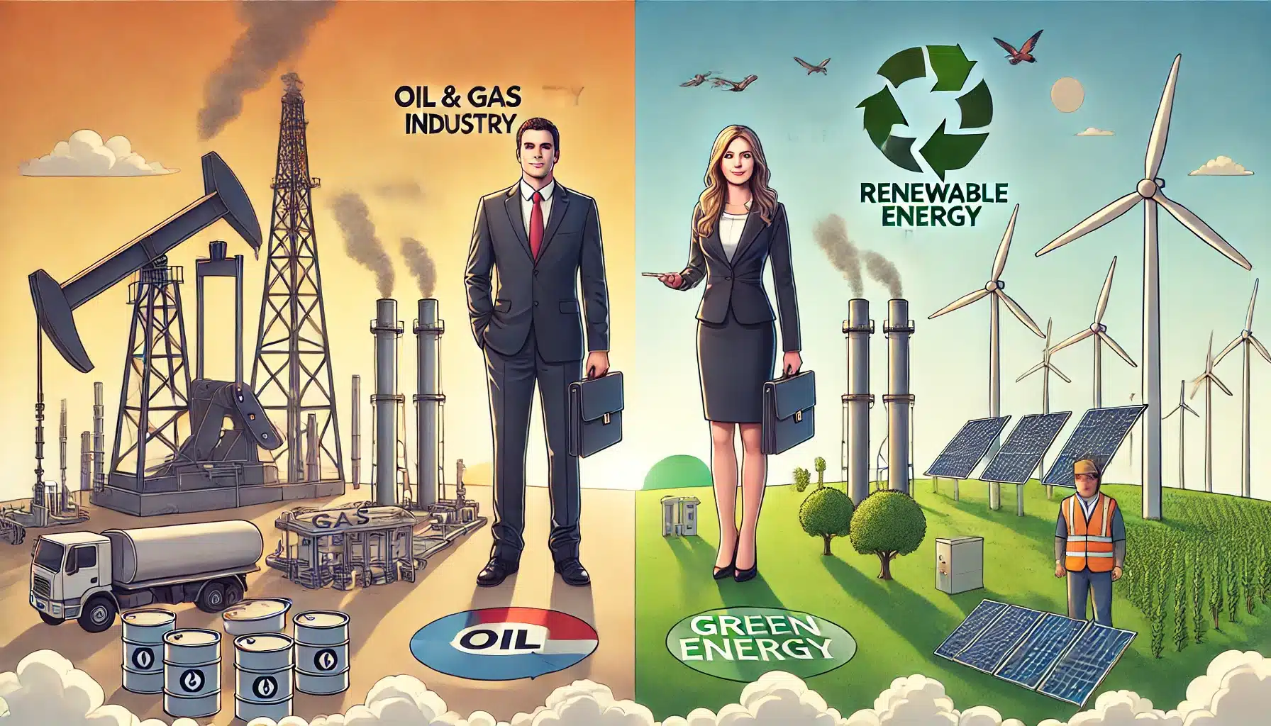 تنقسم الصورة إلى جانبين، الجانب الأيسر يمثل صناعة النفط والغاز مع سماء محمرة والتنقيب عن النفط والتلوث، والجانب الأيمن يظهر الطاقة المتجددة مع سماء زرقاء وتوربينات الرياح والألواح الشمسية. في المنتصف يقف رجل وامرأة يرتديان ملابس العمل، يرمزان إلى كل جانب.