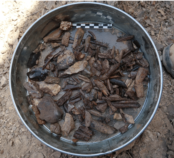 تُظهر الصورة مرشحًا معدنيًا مستديرًا مملوءًا بمجموعة متنوعة من الأحجار والأشياء المتحجرة. تختلف الحجارة في الحجم واللون، ولها شظايا طويلة يمكن أن تكون من الصوان أو الصوان. ويوجد حول الفلتر منطقة حفر ذات تربة جافة، مما يدل على وجود نشاط أثري في المنطقة.