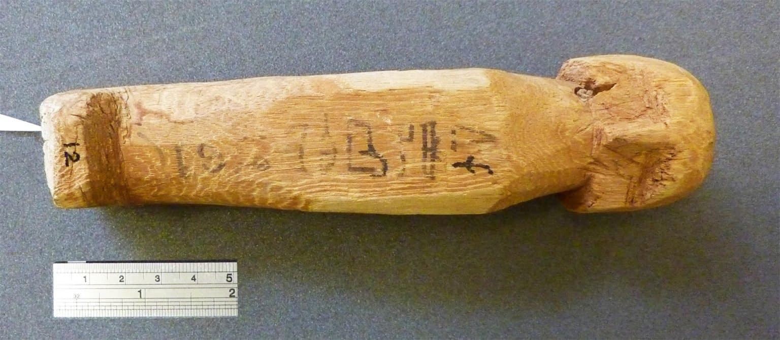 تمثال جنائزي مصري رقم UC 40179 من متوشالح القديمة، يعود تاريخه إلى أوائل الأسرة الثامنة عشرة. يدعم تاريخه بالكربون المشع تسلسلًا زمنيًا أقل لعهدي نبفت أحمس وابنه أمنحتب الأول. حقوق الصورة: إتش جيه بروينز (2017)، نُشر بإذن من متحف بتري للآثار المصرية والسودانية (كلية لندن الجامعية) بموجب ترخيص CC BY.
