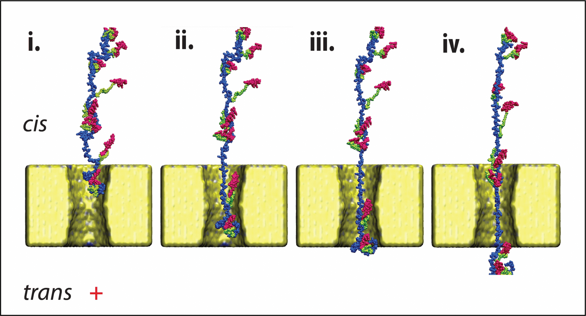 محاكاة حاسوبية تُظهر المرور التدريجي (من اليسار إلى اليمين) لبروتين ألفا لاكتالبومين عبر مسام نانوية صلبة قطرها حوالي 4 نانومتر. يتيح مرور البروتين عبر المسام قراءة تسلسل العلامات المرتبطة بمجموعات السيستين (اللون الأحمر) وتحديد هوية البروتين.