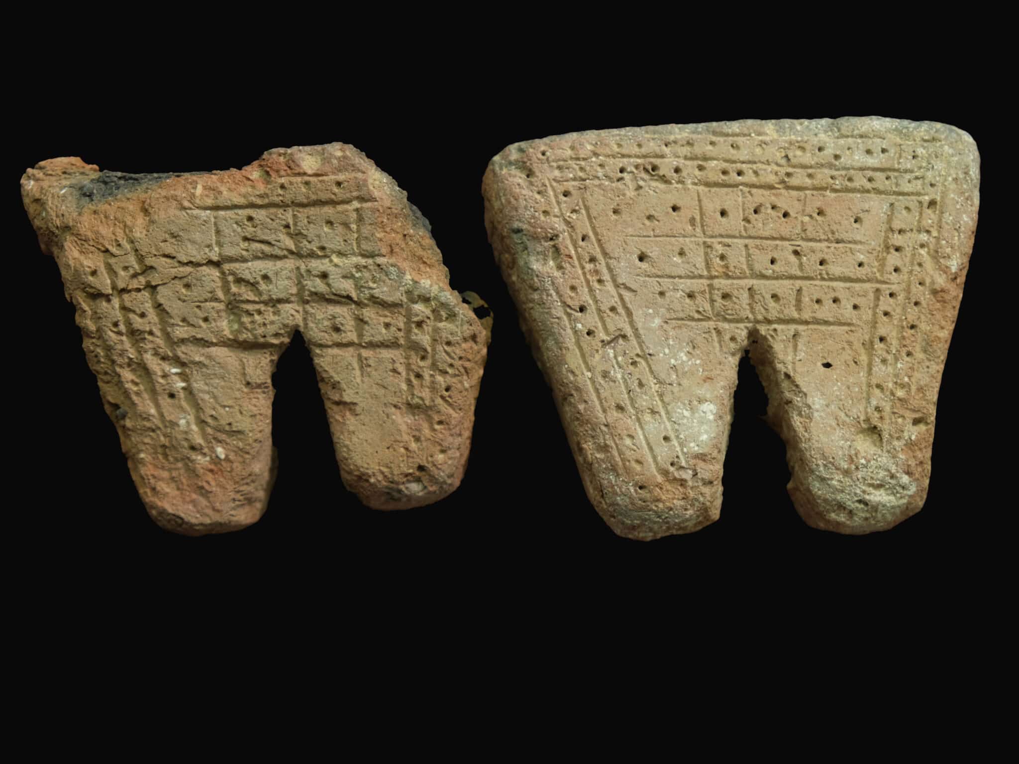 قطعتان خزفيتان قديمتان على شكل مستطيل بقطع مثلث في الأسفل يشكل أسنان بارزة. أشياء مصنوعة من الطين الحراري ذات أنماط هندسية وأخاديد. الشيء الأيسر مهترئ والشيء الأيمن في حالة أفضل. التركيز على الفن والتقاليد القديمة.